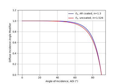 0.002) – The glazing thickness in units of meters. Reference 1 indicates that 0.002 meters (2 mm) is reasonable for most glass-covered PV panels.n_ar (numeric, optional) – The effective index of refraction of the anti-reflective (AR) coating (unitless). If n_ar is None (default), no AR coating is applied. A typical value for the effective index of an AR coating is 1.29.