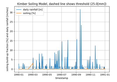 int, default24) – Period for accumulating rainfall to check against cleaning_threshold. The Kimber model defines this period as one day. [hours]