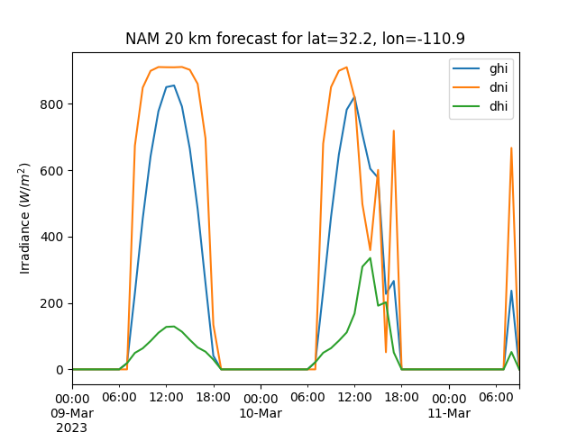 The North American Mesoscale model covers, not surprisingly, North America. It is updated every 6 hours. pvlib provides access to 20 km resolution NAM data with a time horizon of up to 4 days.
